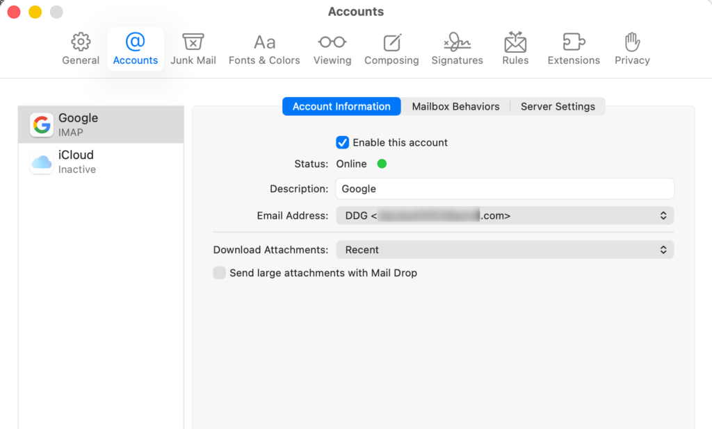 Mac Mail Accounts settings with Gmail IMAP enabled