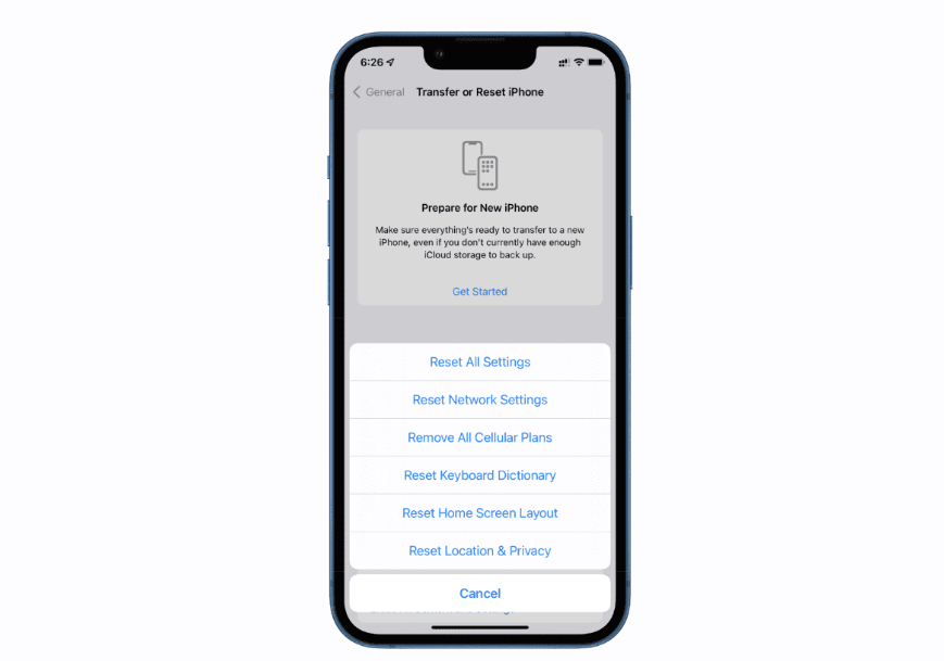 - Select Transfer or Reset iPhone.