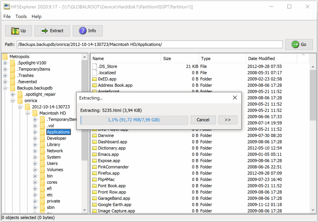 The application provides a simple interface that lets you browse Mac volumes and extract files to your Windows system.